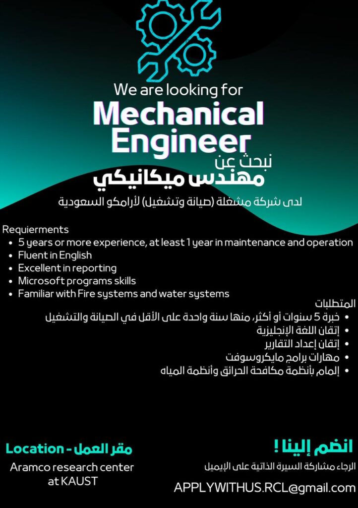 مطلوب مهندس ميكانيكا (صيانة وتشغيل) لدى شركة مشغلة لأرامكو السعودية