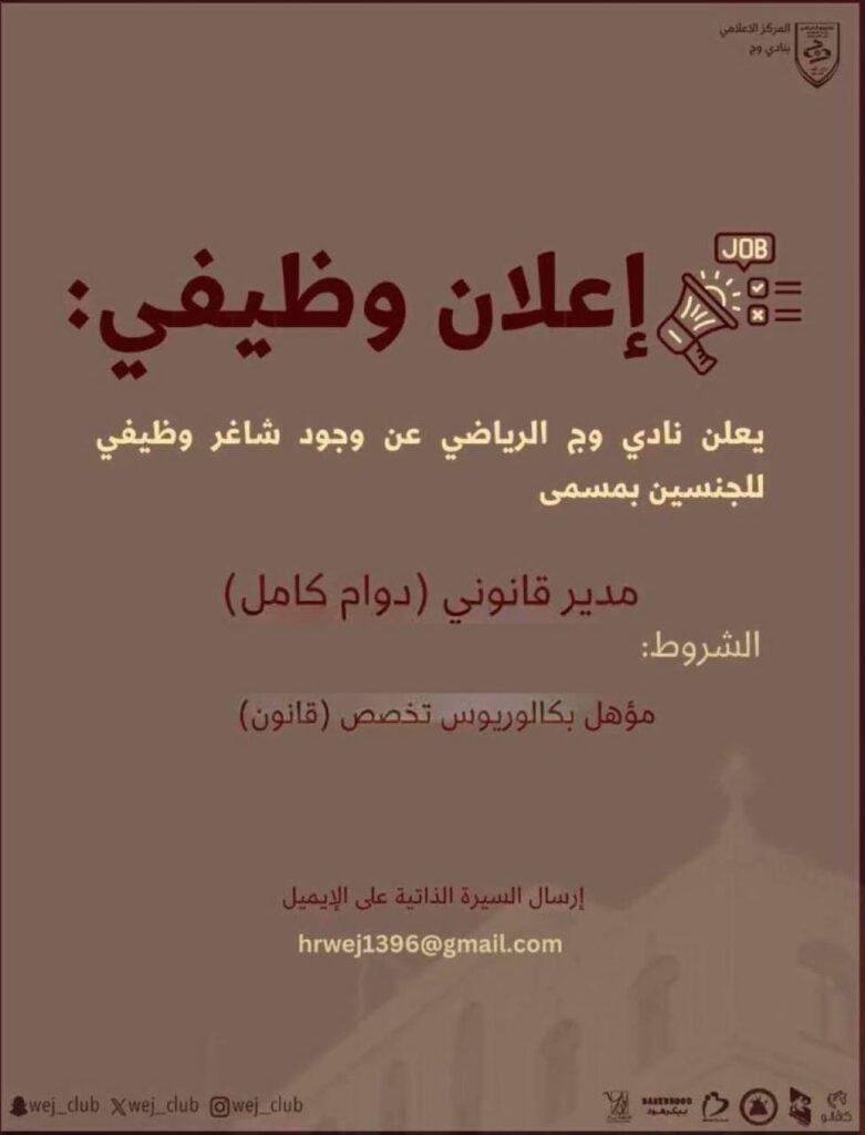 وظائف الرياض وظيفة مدير قانوني للعمل لدى نادي وج الرياضي – للنساء والرجال بواسطة الوظيفة1 في مارس 20, 2025 شارك مع اصدقائك وظيفة مدير قانوني للعمل لدى نادي وج الرياضي – للنساء والرجال طريقة التقديم: التفاصيل والايميل موجود بالصورة بالاسفل شارك مع اصدقائك