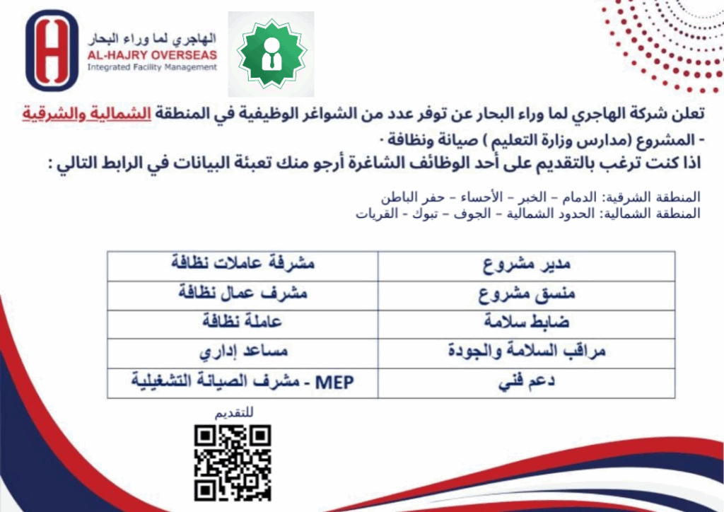 وظائف شركة الهاجري لما وراء البحار عن توفر فرص وظيفية متميزة للكوادر المؤهلة للعمل في مشاريعها المتخصصة في مجالات الصيانة والنظافة. ندعو الكفاءات للانضمام إلى فريق عملنا في كل من المنطقة الشرقية والمنطقة الشمالية، والمساهمة في تقديم خدمات عالية الجودة لعملائنا.