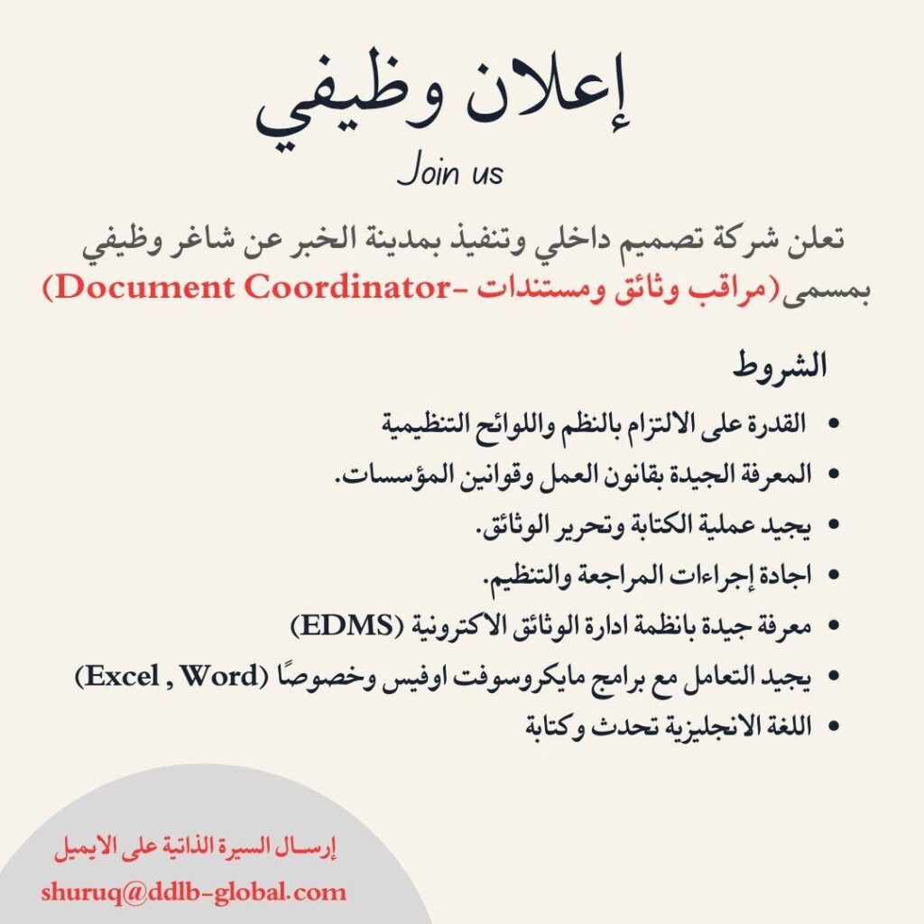 وظائف الشرقية وظيفة مراقب وثائق ومستندات للعمل لدى شركة تصميم داخلي وتنفيذ بواسطة الوظيفة1 في أبريل 28, 2025 شارك مع اصدقائك وظيفة مراقب وثائق ومستندات للعمل لدى شركة تصميم داخلي وتنفيذ يتم ارسال السيرة الذاتية على الايميل المرفق جميع متطلبات الوظيفة موجودة بالصورة بالاسفل شارك مع اصدقائك