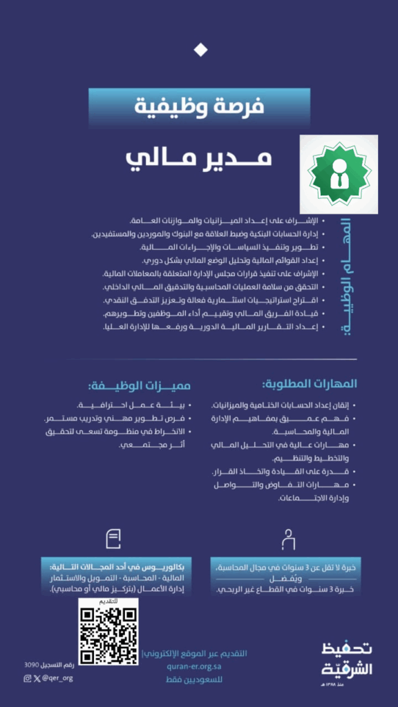 وظائف محاسبين | مطلوب مدير مالي للعمل لدى جمعية تحفيظ الشرقية