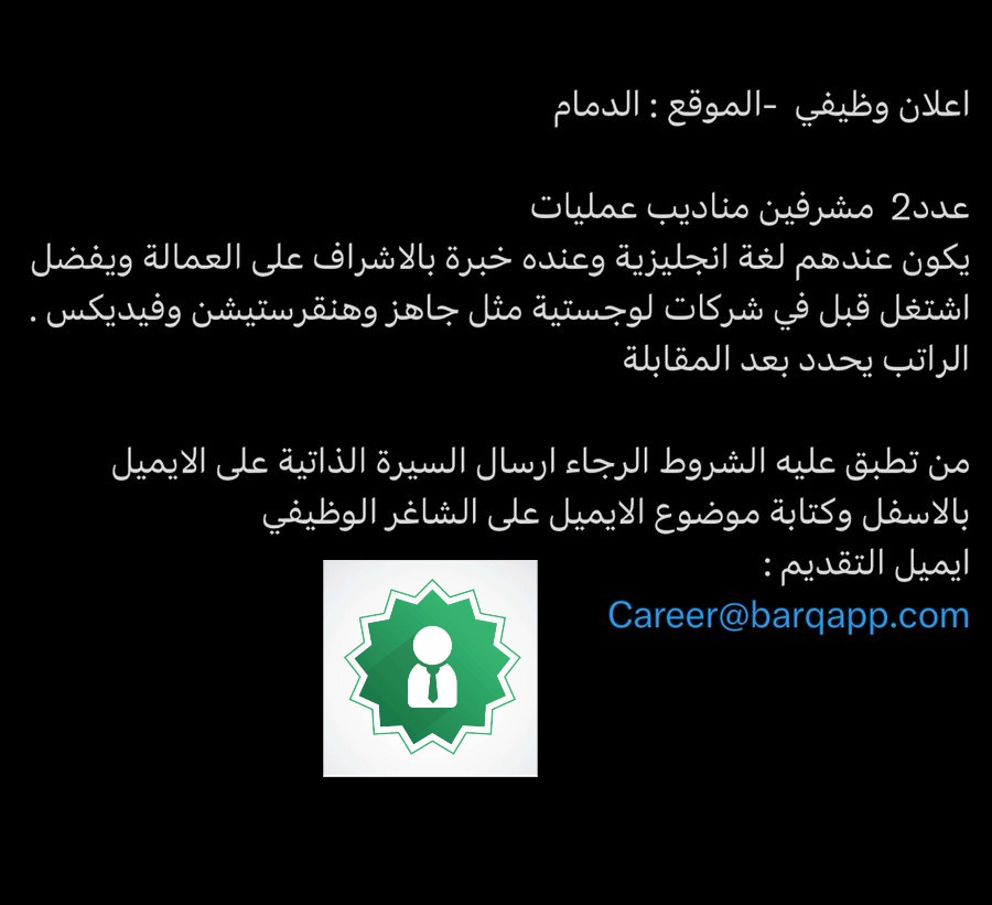 تُعلن مؤسسة لوجستية رائدة عن حاجتها إلى عدد 2 مشرفين مناديب عمليات لديهم خبرة سابقة في إدارة الفرق اللوجستية والتعامل مع تطبيقات التوصيل الحديثة مثل HungerStation وFetchr وFODEL وغيرها.
