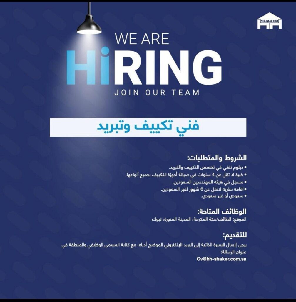 وظيفة فني تكييف وتبريد لدى مجموعة شاكر وإخوانه بعدد من مدن المملكة