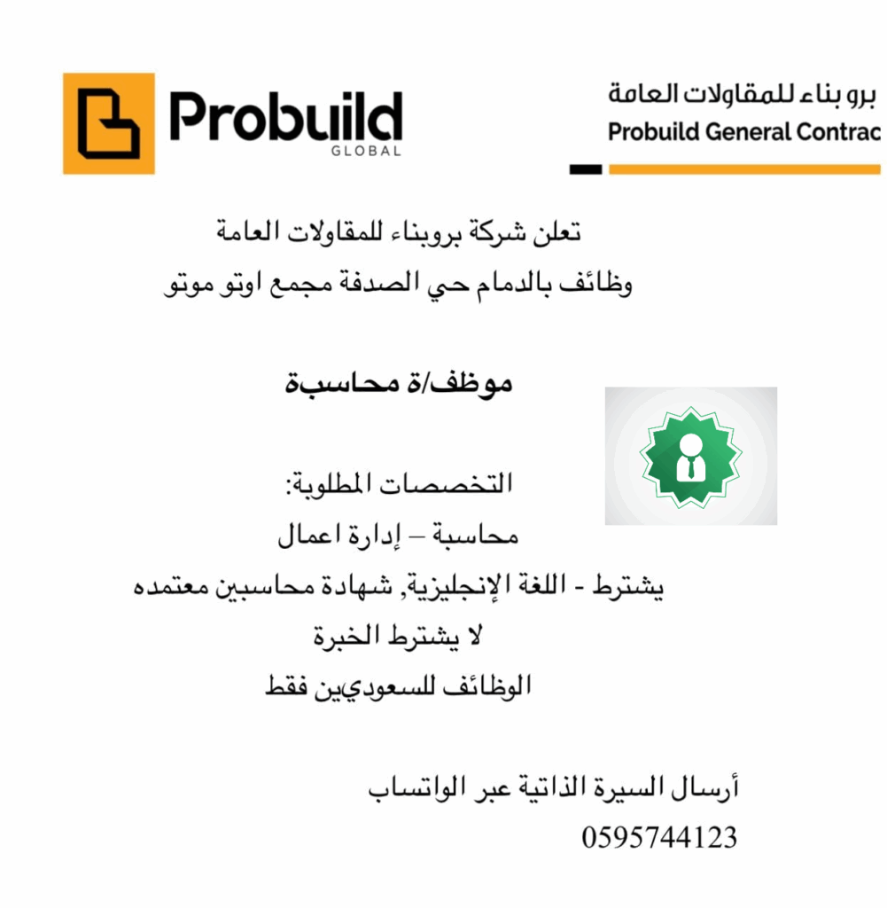 تُعلن شركة بروبناء للمقاولات العامة (Probuild GLOBAL) عن توفر شاغر وظيفي في قسم المحاسبة ضمن مقرها الواقع في مدينة الدمام – حي الصدفة – مجمع أوتو موتو.