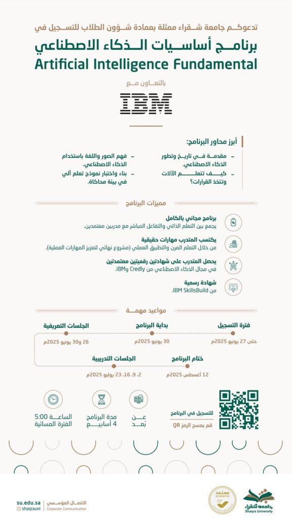 جامعة شقراء بالتعاون مع IBM تدعوكم لبرنامج مجاني (أساسيات الذكاء الاصطناعي) عن بُعد