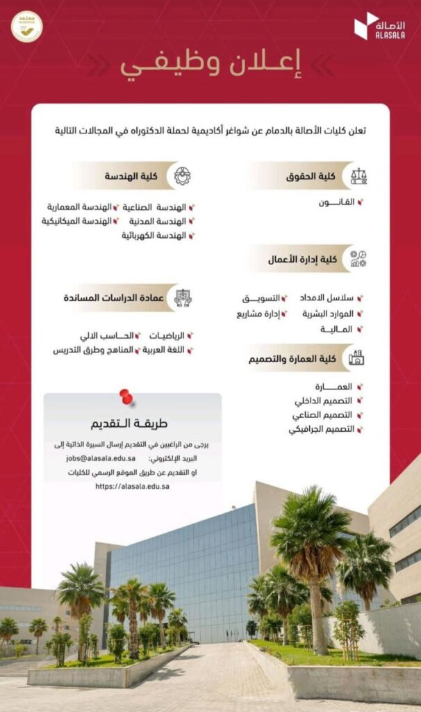 تعلن كليات الأصالة في مدينة الدمام عن توفر فرص أكاديمية شاغرة لحملة درجة الدكتوراه للعام الجامعي القادم، في عدد من التخصصات ضمن كلياتها المختلفة.