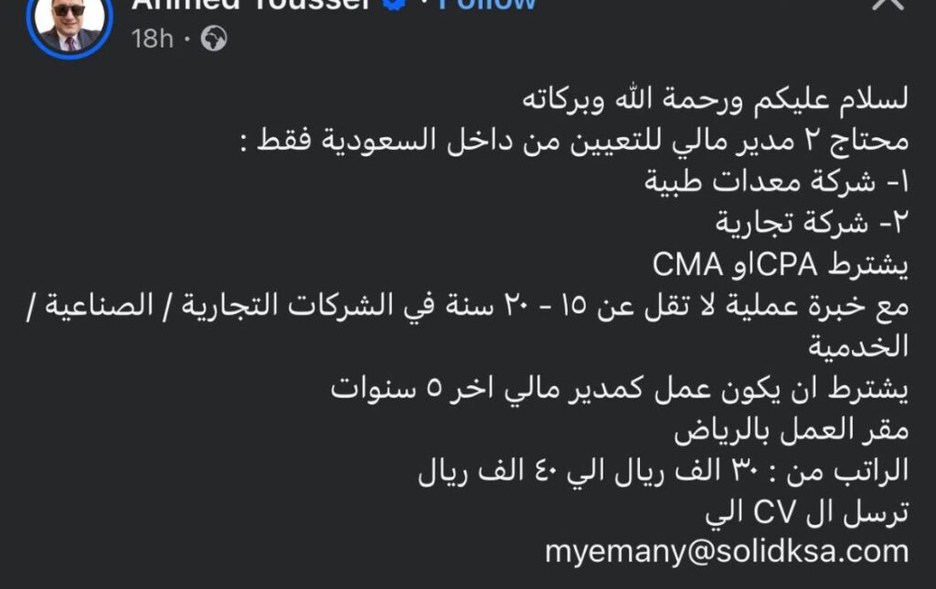 تُعلن شركتان رائدتان في مجالهما (شركة معدات طبية – شركة تجارية) عن حاجتهما لتعيين مدير مالي يتمتع بخبرة واسعة وكفاءة عالية في إدارة الشؤون المالية، وذلك للعمل في مدينة الرياض.