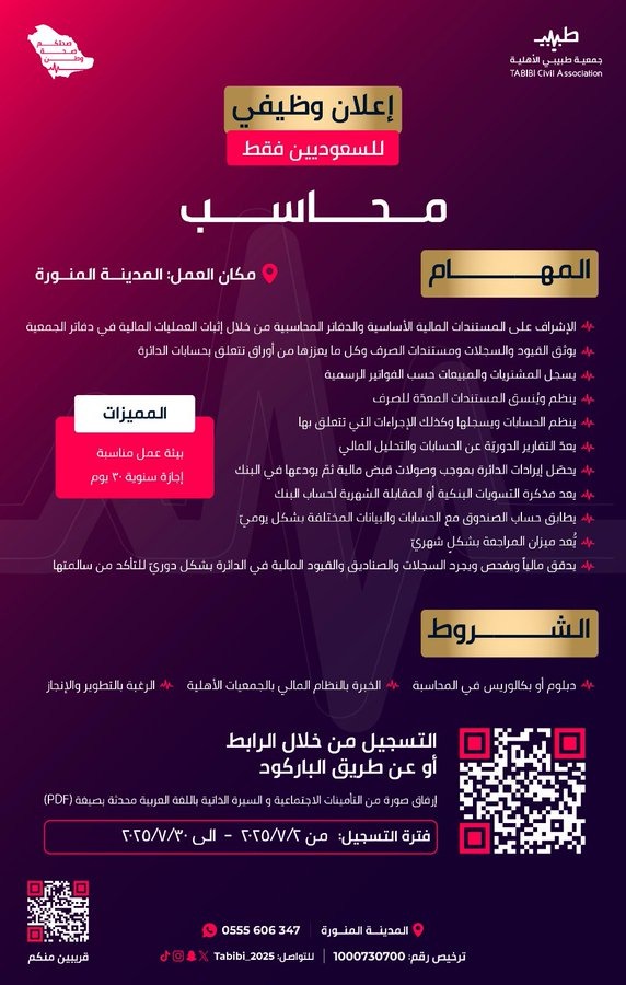 تُعلن جمعية طبيبي الأهلية عن توفر شاغر وظيفي بمسمى محاسب للسعوديين فقط، وذلك للعمل في مقر الجمعية بالمدينة المنورة. يهدف هذا الدور إلى تنظيم السجلات المالية والقيود المحاسبية، والإشراف على العمليات المالية بما يضمن الامتثال للأنظمة المحاسبية المعتمدة للجمعيات الأهلية.