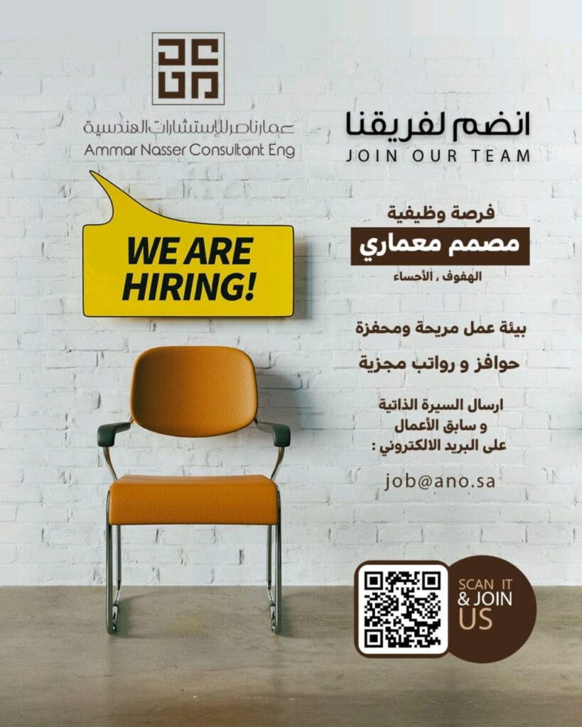 تُعلن شركة عمار ناصر للاستشارات الهندسية (Ammar Nasser Consultant Eng) عن توفر فرصة وظيفية بمسمى مصمم معماري للانضمام إلى فريق العمل في مقر الشركة بمدينة الهفوف – محافظة الأحساء.