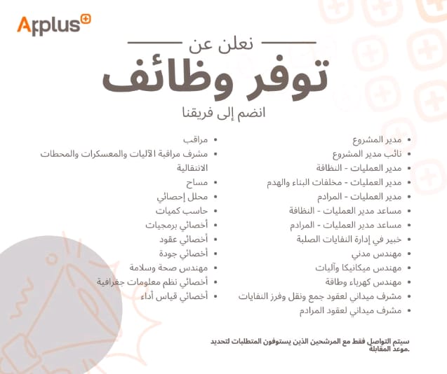 تُعلن شركة Applus+ عن توفر عدد من الفرص الوظيفية للعمل ضمن مشروع “استشاري الرقابة والإشراف على أعمال مشاريع الإدارة العامة لمشاريع النظافة” التابعة لأمانة محافظة جدة.