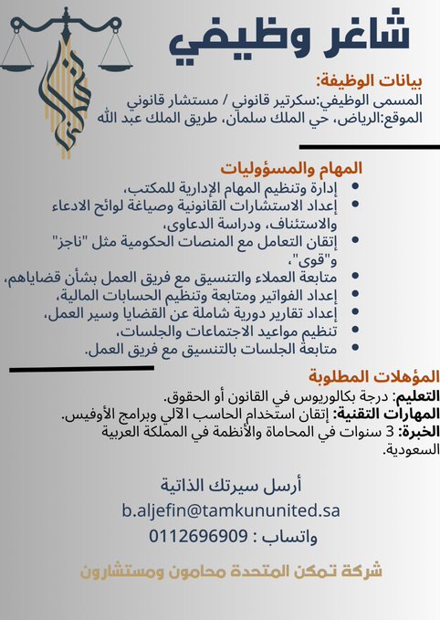 إعلان وظيفة شاغرة: سكرتير قانوني / مستشار قانوني – الرياض