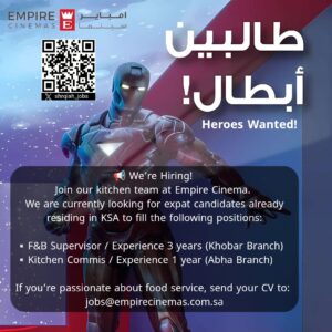تُعلن إمباير سينما (Empire Cinemas) عن توفر شواغر وظيفية للانضمام إلى فريق العمل في قسم الأطعمة والمشروبات، وذلك في فروعها بكل من الخبر وأبها.