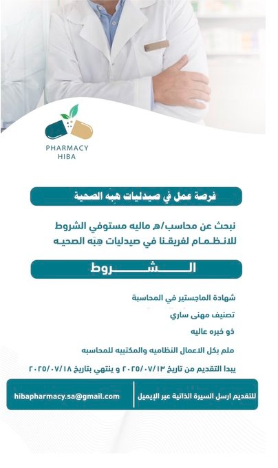 وظيفة شاغرة: محاسب مالي – صيدليات هبة الصحية