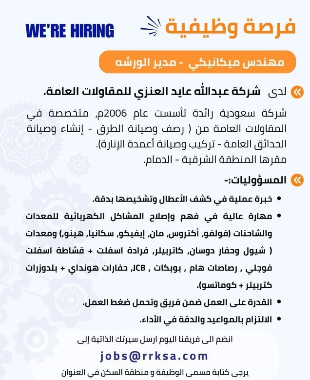 وظائف شاغرة في الدمام مطلوب مهندس ميكانيكي ومدير ورشة – وفق المتطلبات