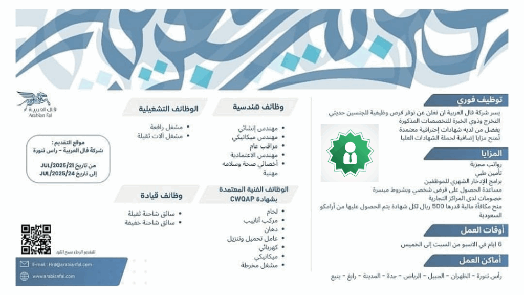 شركة فال العربية (Arabian Fal) تعلن عن فتح باب التوظيف الفوري للجنسين لشغل وظائف تشغيلية وهندسية وفنية وقيادية في مناطق متعددة داخل المملكة العربية السعودية.