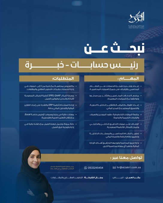 فرصة وظيفية – رئيس حسابات لدى شركة الزكري العقارية