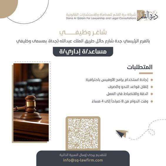 وظيفة مساعد إداري شاغرة للعمل لدى مكتب محاماة في جدة للجنسين