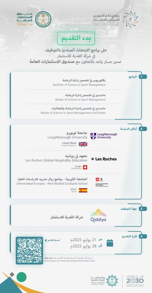 أعلنت شركة القدية للاستثمار، بالتعاون مع صندوق الاستثمارات العامة وضمن مسار (واعد) التابع لـ برنامج خادم الحرمين الشريفين للابتعاث الخارجي، عن فتح باب التقديم على برامج الابتعاث المبتدئ بالتوظيف 2025، والتي تهدف إلى تأهيل وتطوير الكفاءات الوطنية في تخصصات إدارة الرياضة وتنظيم الفعاليات.