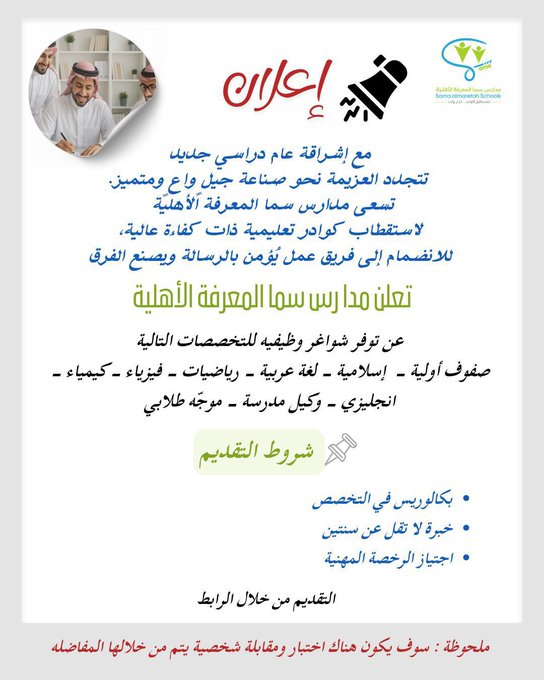 مدارس سما المعرفة الأهلية تعلن عن وظائف تعليمية للعام الدراسي الجديد