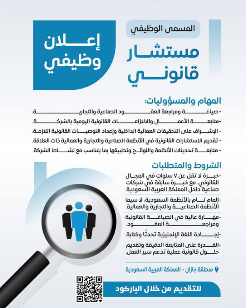 إعلان وظيفة: مستشار قانوني – جازان، المملكة العربية السعودية