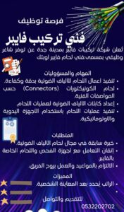 🎯 إذا كنت تمتلك المهارات والخبرة في مجال تركيب الألياف الضوئية وتبحث عن فرصة مهنية متميزة، فهذه الوظيفة مناسبة لك.