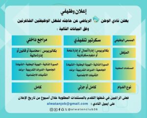 إعلان عن وظائف شاغرة في نادي الوطن الرياضي – وظائف إدارية