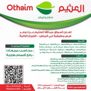 تُعلن شركة أسواق عبدالله العثيم، إحدى كبرى شركات البيع بالتجزئة في المملكة العربية السعودية، عن توفر وظائف شاغرة لحملة الثانوية العامة فأعلى، وذلك للعمل في فروعها المنتشرة بمدينة الرياض، ضمن بيئة عمل محفّزة ومزايا مميزة.