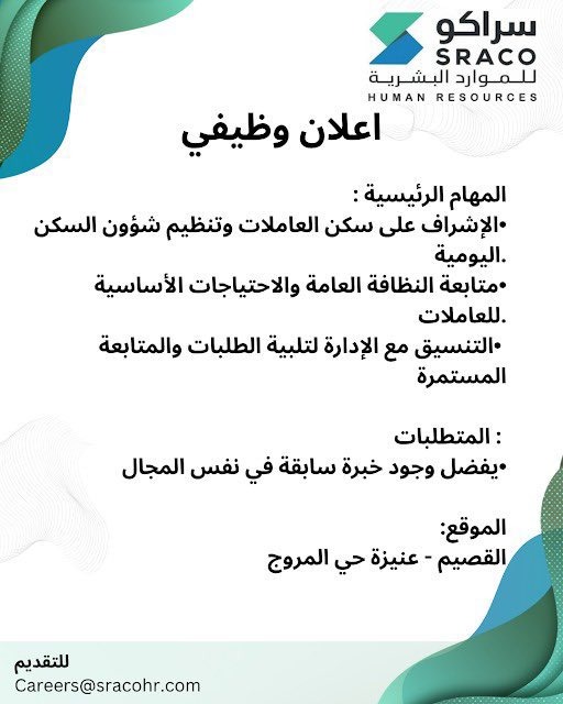 وظيفة مشرف سكن عاملات للاشراف وتنظيم متطلبات العاملات اليومية