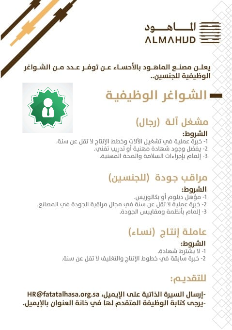 يُعد مصنع الماهود بالأحساء واحداً من المصانع الرائدة في مجال الإنتاج والتصنيع، حيث يسعى إلى استقطاب الكفاءات الوطنية من الجنسين لتطوير منظومته الإنتاجية وتعزيز الجودة. يفتح المصنع الآن باب التوظيف لعدد من الشواغر الوظيفية المناسبة للمؤهلين وأصحاب الخبرة.