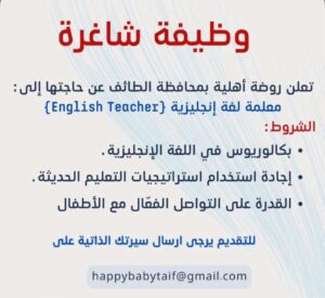 فرصة عمل: معلمة لغة إنجليزية – روضة أهلية – الطائف