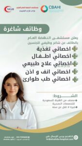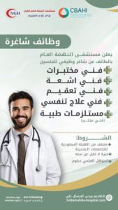 يعلن مستشفى النهضة العام (NGH)، أحد أبرز المستشفيات في مدينة الطائف، عن توفر عدد من الشواغر الوظيفية المتميزة للجنسين. ندعو الكفاءات الطبية والصحية للانضمام إلى فريقنا المتخصص والمساهمة في تقديم رعاية صحية عالية الجودة.
