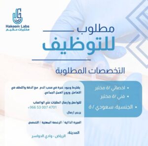 تعلن مختبرات حكيم عن توفر فرص وظيفية في مجال المختبرات الطبية للانضمام إلى فريق عمل محترف يقدم خدمات مخبرية عالية الجودة، وذلك وفقًا للتفاصيل التالية: