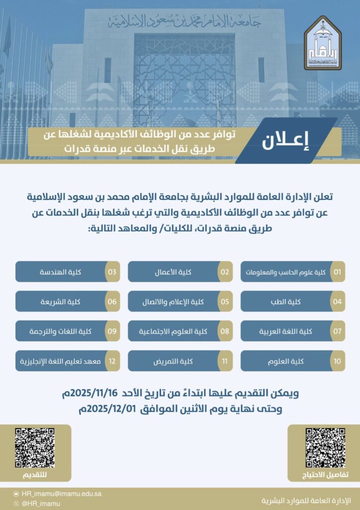 أعلنت جامعة الإمام محمد بن سعود الإسلامية ممثلة في الإدارة العامة للموارد البشرية عن توفر عدد من الوظائف الأكاديمية المراد شغلها عبر نقل الخدمات في مجموعة من الكليات والمعاهد التابعة للجامعة، وذلك من خلال منصة قدرات للتوظيف، وفق التفاصيل التالية: