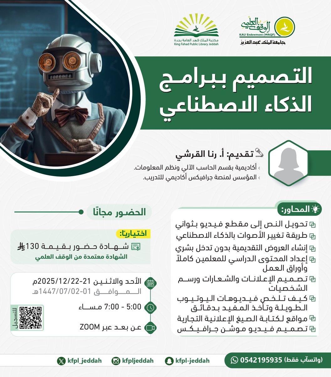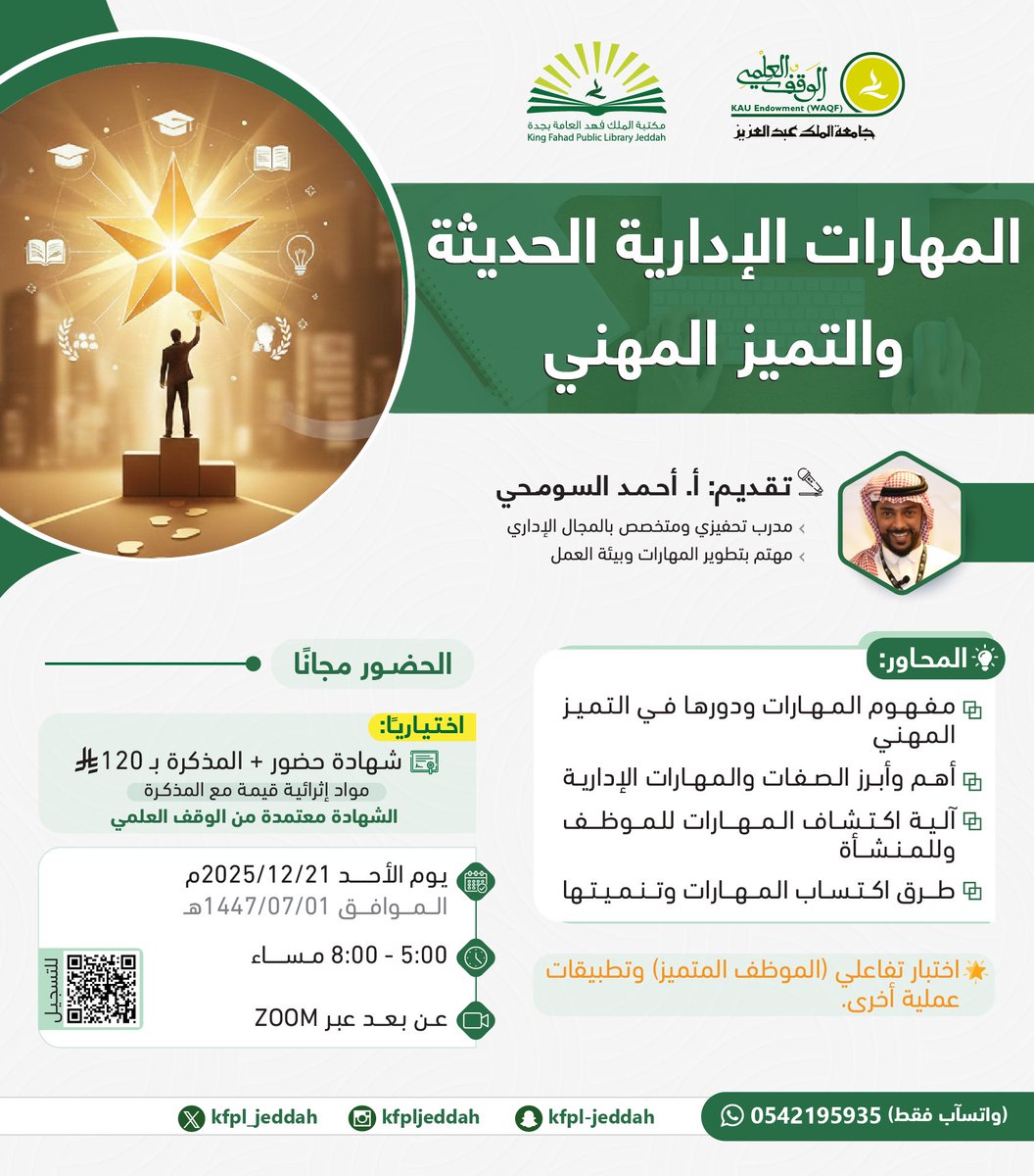 أعلنت مكتبة الملك فهد العامة بجدة بالتعاون مع الوقف العلمي بجامعة الملك عبدالعزيز عن إقامة 13 دورة تدريبية (عن بُعد) في مجموعة واسعة من المجالات الإدارية والشخصية والتقنية، وستكون هذه الدورات مجانية الحضور مع إمكانية الحصول على شهادة اختيارية برسوم، وذلك وفقاً للتفاصيل الموضحة أدناه.
